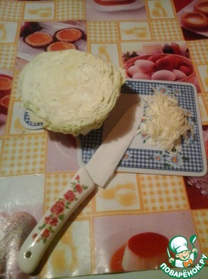 6 слой: очень тонко и мелко нарезанная капуста, помятая с солью и сбрызнутая уксусом. Внимание! От тонкости нарезки капусты будет зависеть успех всего блюда. Можно сразу подавать на стол.