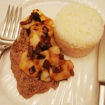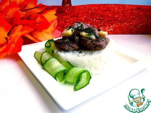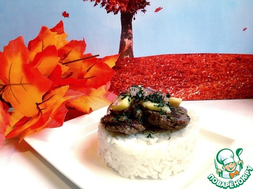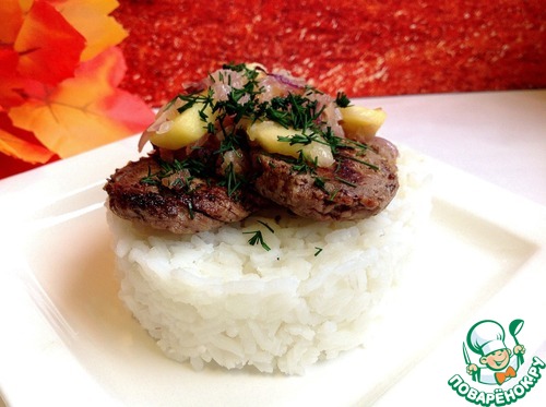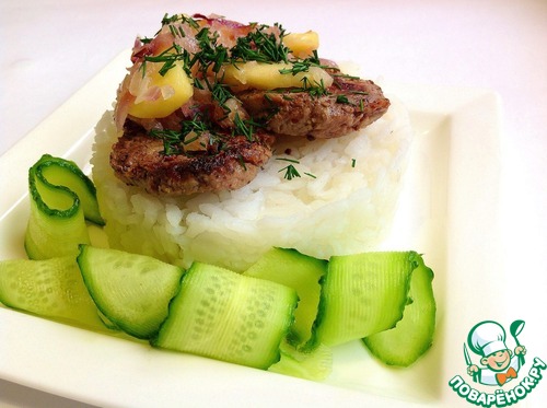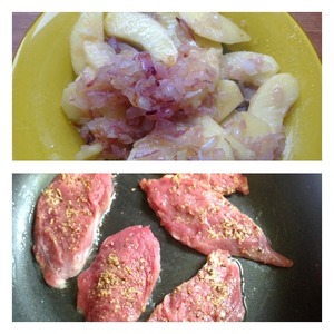 Снимаем шумовкой лук с яблоками, чтобы стекло лишнее масло и выкладываем на тарелку. В оставшемся масле на сильном огне обжариваем мясо с двух сторон, не более 3 мин на каждую сторону.