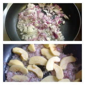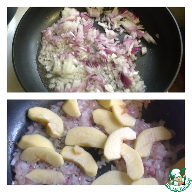 Лук мелко нашинковать и обжарить в ароматном чесночном масле. Яблоко очистить от кожуры и семян, нарезать небольшими кусочками и выложить к уже почти годовому луку. Аккуратно перемешиваем, чтобы не ломать яблоки, и обжариваем минуты 2.