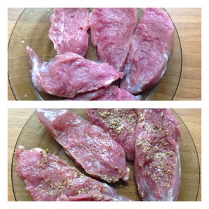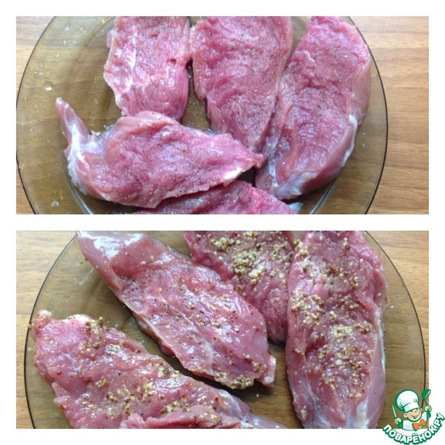 Мясо нарезаем на небольшие стейки, солим и перчим. Каждый кусок обмазываем горчицей