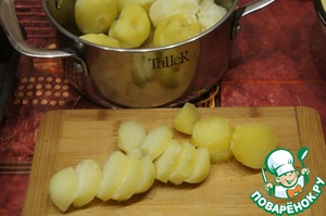Воду слить, картофель обсушить и нарезать толстенькими кружочками.