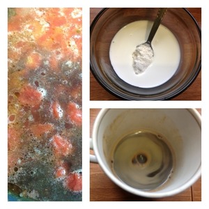 В сливки добавить муку и взбить, чтобы не было комочков. В 100 мл кипятка заварить 1 ч. л. растворимого кофе. Кофе добавляем к томатам