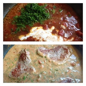 Добавляем сливки с мукой и мелко нарезанный укроп, добавляем соль и сахар, все перемешиваем. Даем закипеть, выкладываем мясо к соусу и тушим на медленном огне минут 10.