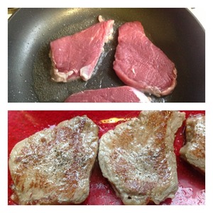 В небольшом количестве оливкового масла обжарить мясо с двух сторон на сильном огне, не более 2 мин. на каждую сторону. Готовые мясо выложить на тарелку, посолить и поперчить.