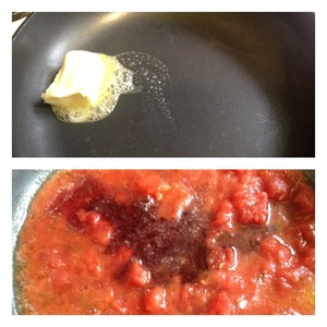 В чистую сковороду положить кусочек сливочного масла. Отправить к нему томаты в собственном соку (у меня очищенные и нарезанные на кусочки) и вино. Потушить минут 5 на среднем огне.