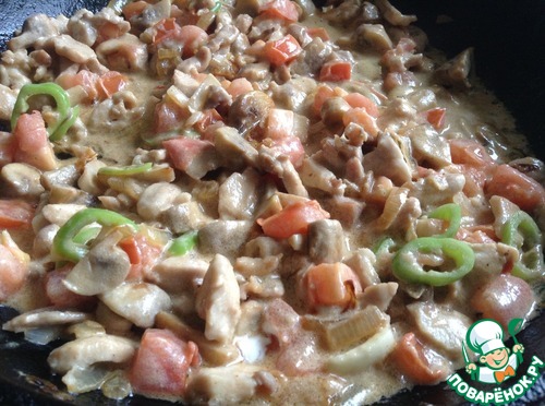 Через 2 минуты добавляем нарезанные кубиками помидоры, тонко нарезанный перец (у меня полуострый перец чили), перемешиваем и даем прогреться полминуты. -
