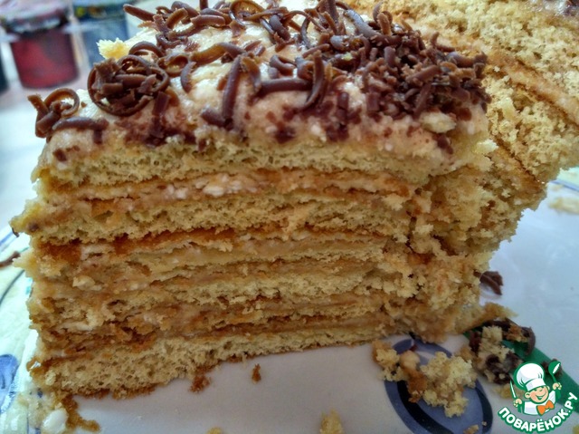 тесто: 2 яйца, 0,5 стакана сахару, 3 ст.ложки меда, 2 стакана муки. 1 ст. ложка соды негашенной (беру 1 ч.ложку)