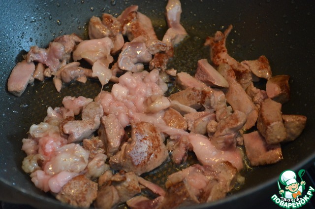 У печени убираем все протокии, пленки и, нарезав крупными кусочками, обжариваем на оливковом масле до полуготовности. Репчатый лук крупно нарезаем и также обжариваем. Хлеб слегка подсушим в тостере или духовке.