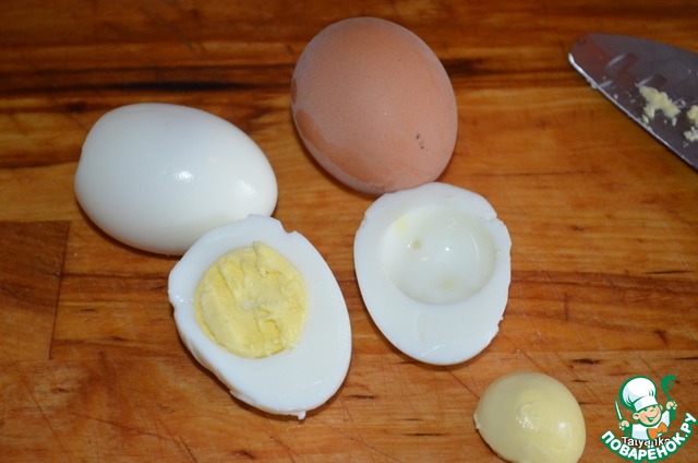 2 яйца отвариваем. Отделяем желтки от белков. Белки рубим и добавляем к печени и луку. Желтки натираем на крупной терке.