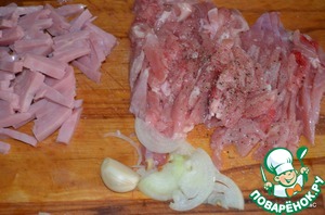 Ветчину нарезаем полосочками. С курицы обрезаем мясо с костей, убираем кожу. Тонко-тонко нарезаем репчатый лук. Если любите, раздавите зубчик чеснока ножом к курице. Все хорошо подсолить, поперчить.