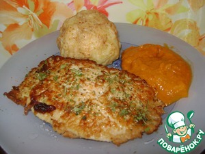 • Грудку хорошенько обмакиваем в кляре, и жарим на подсолнечном масле на хорошо разогретой сковороде. Жарим на большом огне до золотистой корочки с двух сторон. Выкладываем в кастрюльку, добавляем немного воды и пропариваем под крышкой минут 5-7.