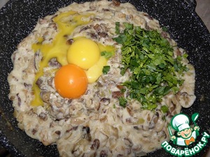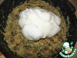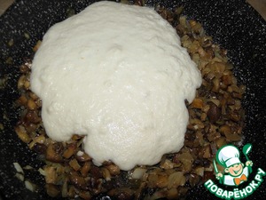 Размоченный хлеб хорошо перемешать ( делайте на свое усмотрение, я когда хочу запеканку, то просто перемешиваю до однородной массы, и чуть отжимаю лишнюю жидкость, а когда делаю жульен- запеканку, то вместе со всем молоком пюрирую в блендере). Затем добавить к жаренным грибам.