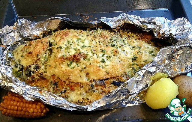 Сверху рыбу смазать сметаной (кроме головы) и посыпать пшенными хлопьями. Кладем рыбу в рукав для запекания. Запекаем в разогретой духовке около 1 часа на медленном огне.