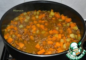 Затем добавляем фарш. Помешивать и жарить до готовности фарша.