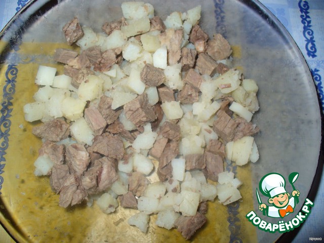 Картофель очистить от кожуры и нарезать кубиками. Говядину нарезать так же.