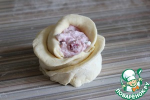 В центр квадрата теста кладу 1,5 ч. л. начинки. Формирую "розочку". Поочередно приподнимаю треугольники боковых сторон, заворачиваю их вокруг начинки, защипываю в районе дна. Можно подрезать "лепестки", чтоб было красивее.