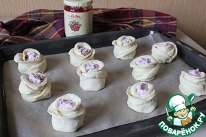 Смазываю лепестки "розочек" слегка взбитым желтком. Противень ставлю в разогретую до 180 градусов духовку. Общее время выпекания 45 минут. При этом через 15 минут уменьшаю температуру до 160 градусов.