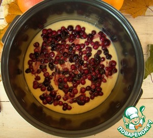 Я выпекаю кекс в мультиварке. Потому переливаем тесто в смазанную сливочным маслом чашу и поверх теста распределяем ягодный соус. Не переживаем, в процессе выпечки ягодки окажутся внутри кекса.
