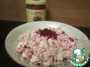 Подготовить начинку: творог перемешать с брусничным соусом.