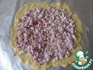 Сверху на сырный пласт равномерно распределить творог с брусникой.