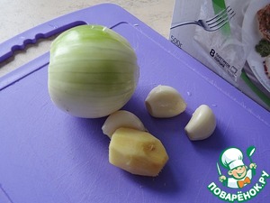 Почистите лук, чеснок и имбирь. Поставьте кастрюлю с водой для варки риса на огонь.