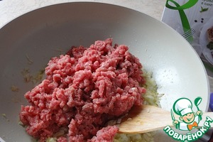 Добавьте фарш и жарьте на сильном огне минут 5. Убавьте огонь.