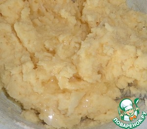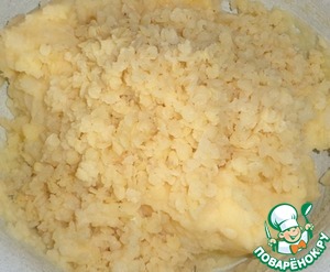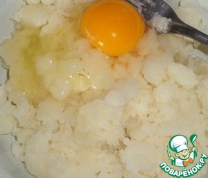 Картофель также следует отварить и размять. Пшенные хлопья залить горячей водой, чтобы разбухли. Когда картофель немного остынет, то добавляем яйцо. -