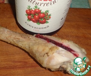 Каждую голень надрезать и кладем клюквенный соус в надрез.