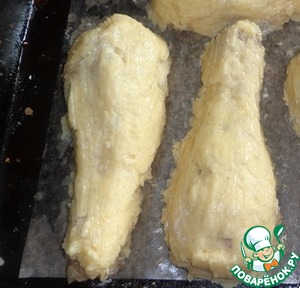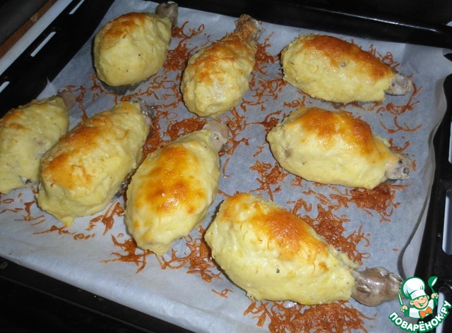 Выкладываем куриные ножки на противень, застеленный пекарской бумагой. Каждую ножку покрываем тестом. Сверху смазываем с помощью кисточки растительным маслом и посыпаем натертым на мелкой терке сыром.