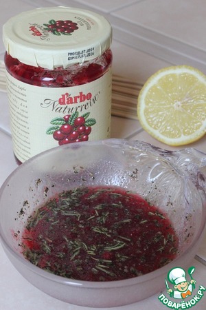Делаю маринад. В глубокую миску вливаю оливковое масло, добавляю брусничный соус Darbo, все специи.