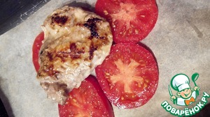 На пергамент выложите нарезанный кружочками помидор. Посолите, поперчите. На помидор выложите шницель. -