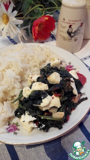 Шпинат бланшируйте, слейте воду и смешайте с тертой цедрой и чесноком, нарезанным пластинками.
