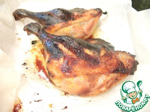 Утиное мясо (у меня две ножки) маринуем и оставляем на 1-2 часа. Маринад: цедра апельсина, мед, корица, мускатный орех, имбирь, соль, перец.