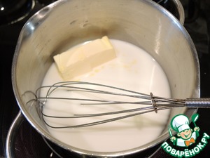 Приготовим заварное тесто для булочек. Молоко смешиваем с водой, солим, доводим до кипения и кладем сливочное масло.