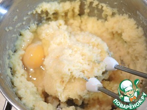 Постепенно вводим муку, тщательно при этом мешая наше тесто. Снимаем с огня и остужаем, затем по одному вбиваем яйца. Получается гладкое мягкое тесто.