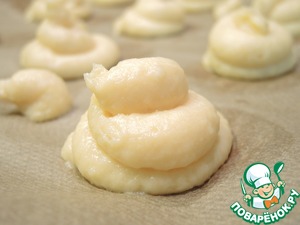 С помощью кулинарного мешка или просто ложек выкладываем тесто на противень, застеленный пекарской бумагой.