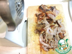 Пока булочки остывают сделаем из готового утиного мяса крем. Для этого мясо пропускаем на мясорубке через среднюю решетку два раза.