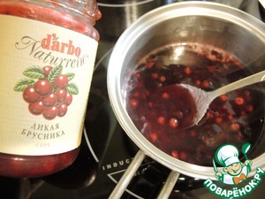 Теперь приготовим соус для булочек. Возьмем соус "Дикая брусника D'arbo", нагреем его в сотейнике с толстым дном, добавим к нему тростниковый сахар, красное вино и будем варить на медленном огне минут 15.
