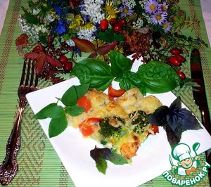 • Взбила яйца в миксере и вылила в сковороду с овощами. ( Если не спешите, тогда взбейте всё по отдельности, белок и желток. )