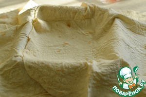1. Форму, уменя 20*20 см, застелить лавашом. Сначала выложить 1 лист, чтоб большая часть его свисала, затем второй сверху, чтоб большая часть свисала в другой бок.