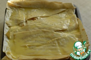 6. Затем я срезала оставшиеся края и накрыла начинку кусочками лаваша. Верх пирога смазала заливкой.
