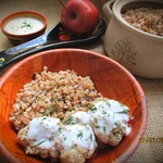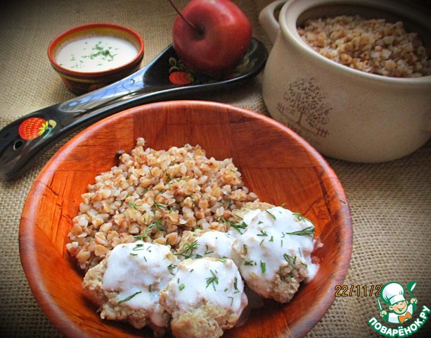 Клецки готовы. Выкладываем их вместе с гречкой, поливаем соусом и подаем.