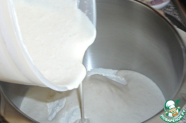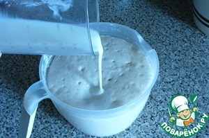 Теперь, смешиваем кефир 100 мл. с водой 100 мл. и вливаем в опару. Перемешиваем. Опара будет продолжать пузыриться.