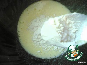 Затем добавить муку, всё смешать и добавить сметану, опять перемешать.