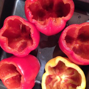 • В процессе подготавливаем перцы к фаршированию, чтобы они стали более пластичными опускаем их в горячу воду на 4-6 минут, потом в холодную.