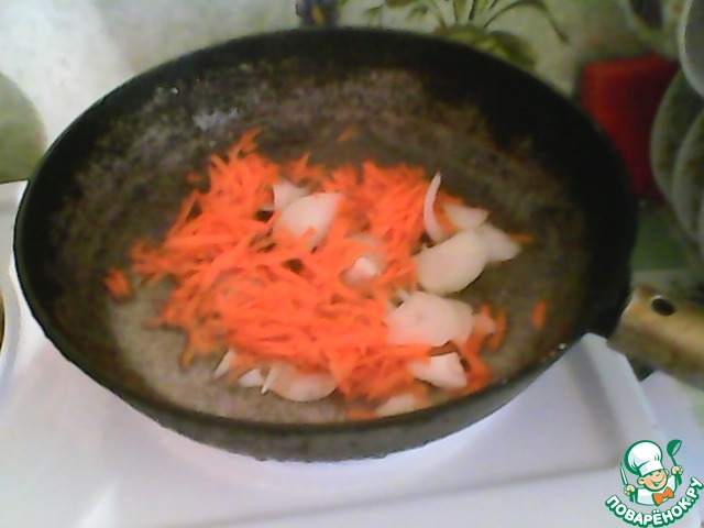Начинаем обжаривать лук и морковь на разогретой сковороде с добавлением растительного масла. Я добавляю сначала 2 ст. л. масла для пассеровки моркови и лука, а остальную часть, когда буду добавлять муку.