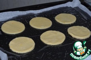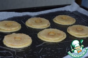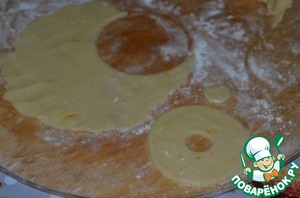 Тесто раскатать, круглой выемкой (диаметром чуть больше нарезанных яблок) вырезать низ печенья.