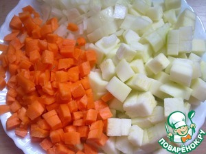 Очистить лук и чеснок. Нарезать небольшими кубиками. Морковь и кабачки тоже нарезать кубиками.