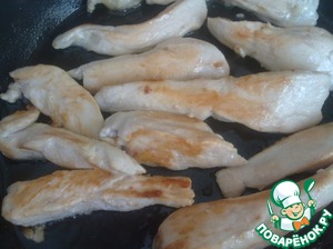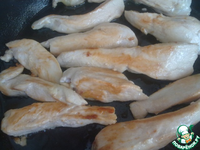 Теперь берем куриное филе режем на кусочки и обжариваем на растительном масле до золотистой корочки.