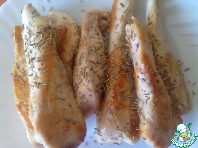 После того, как мясо приготовится, выкладываем его на тарелку и посыпаем розмарином. Куриному филе дать немного остыть.